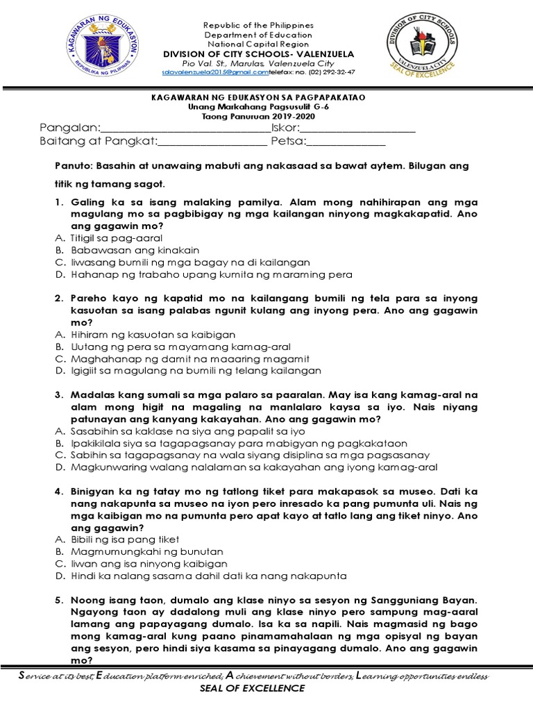 Pinupuri mo ang mga batang may taglay na kahusayan sa pag-awit. Para bang hindi ko nakukuha ang pansin ng mga taong nakapalibot sa akin lalo na ng aking mga kamag-aral sapagkat hindi naman ako maganda. 1 question Maayos na pakikitungo sa aking mga kamag aral o kaibigan.